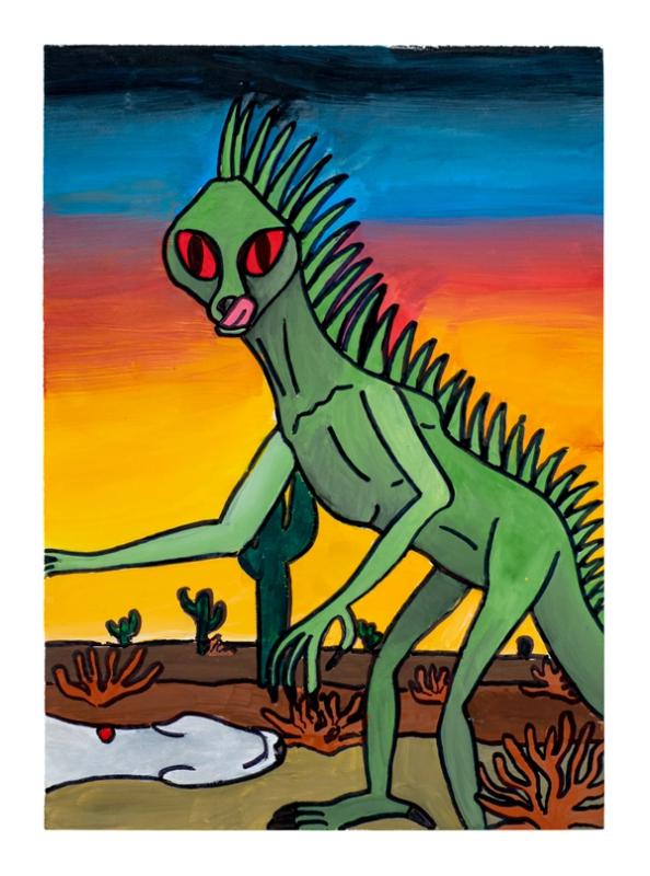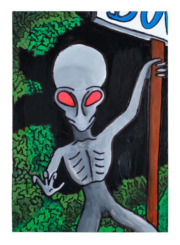 Whether painting, illustrating, or drawing, Weinhold constructs the world he wants to inhabit, one where aliens, monsters, and supernatural creatures move among us, at once bored and delighted by the mundane, ever curious about the unknown.