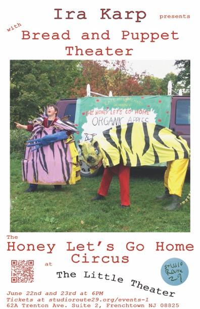 Next Thursday and Friday ~ Ira Karp with Bread and Puppet Theater Puppeteers bring The Honey Let's Go Home Circus here to Frenchtown. Studio Route 29 Players will be part of the performances on both nights- come see BJ Armour, Bernadette Simone, Christian Turner, Sean Bodine, Theo Baransky, Sam Leatherdale, Rich Auth and probably more doing their thing alongside these seasoned puppeteers and performers. Yahoo!